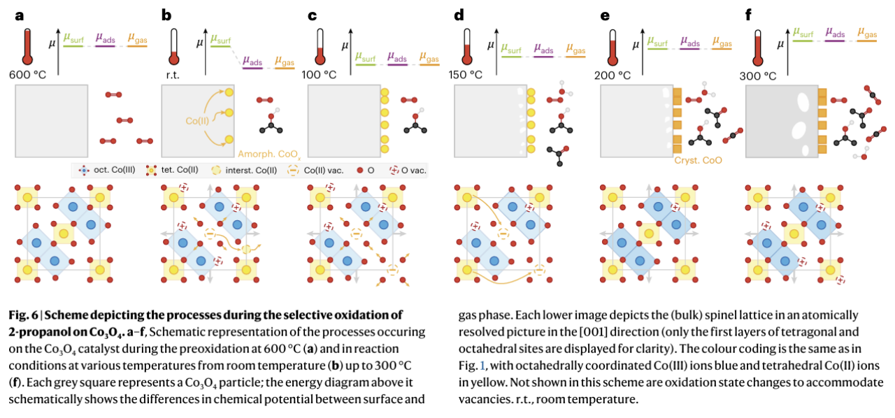 作者將原本靜態(tài)的催化機理,升格為一幅動態(tài)的、受化學勢梯度驅(qū)動的固態(tài)相演變圖景。從室溫起,氣相(異丙醇還原性)與體相(高價氧化物)的化學勢差異,驅(qū)動了體相陽離子向表面遷移(溶出),導致表面失氧和還原(對應 Fig 3),同時在體相留下空位導致晶格異常膨脹(對應 Fig 5c)。隨著溫度升高,空位聚集成納米孔洞(對應 Fig 4),表面無定形溶出物最終在 225°C 以上結(jié)晶為穩(wěn)定的 CoO 相(對應 Fig 5a, b)。